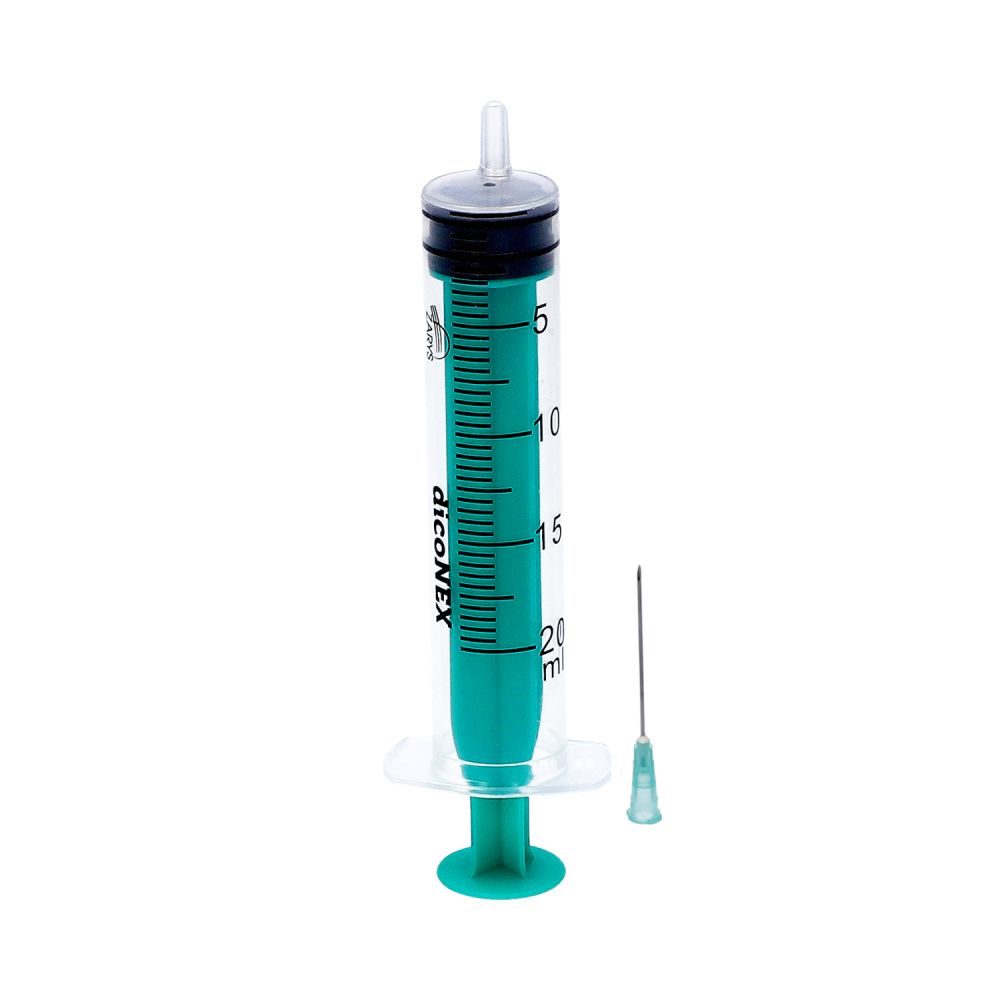 Vienreizējās lietošanas šļirce, trīsdaļīga, ar adatu blakus šļircei, 20 ml Luer savienojums, zaļš virzulis, bez ftalātiem_A100