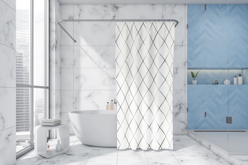 Vannas istabas (dušas) aizskars, izmērs platums 180 cm., garums 200 cm., balts vai pelēks, materiāls poliesters, pielietošanas veids ūdeni atgrūdošs, viegli kopjams, komplektā 12 gredzeni